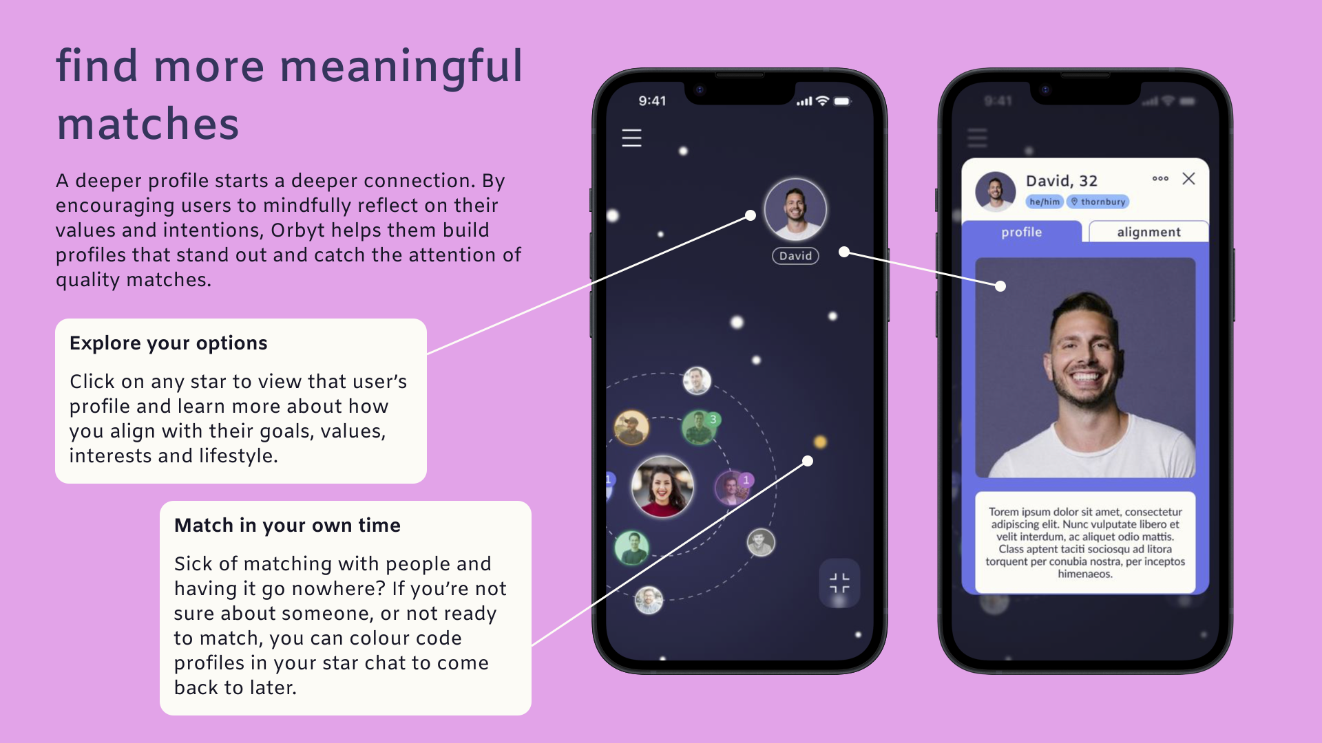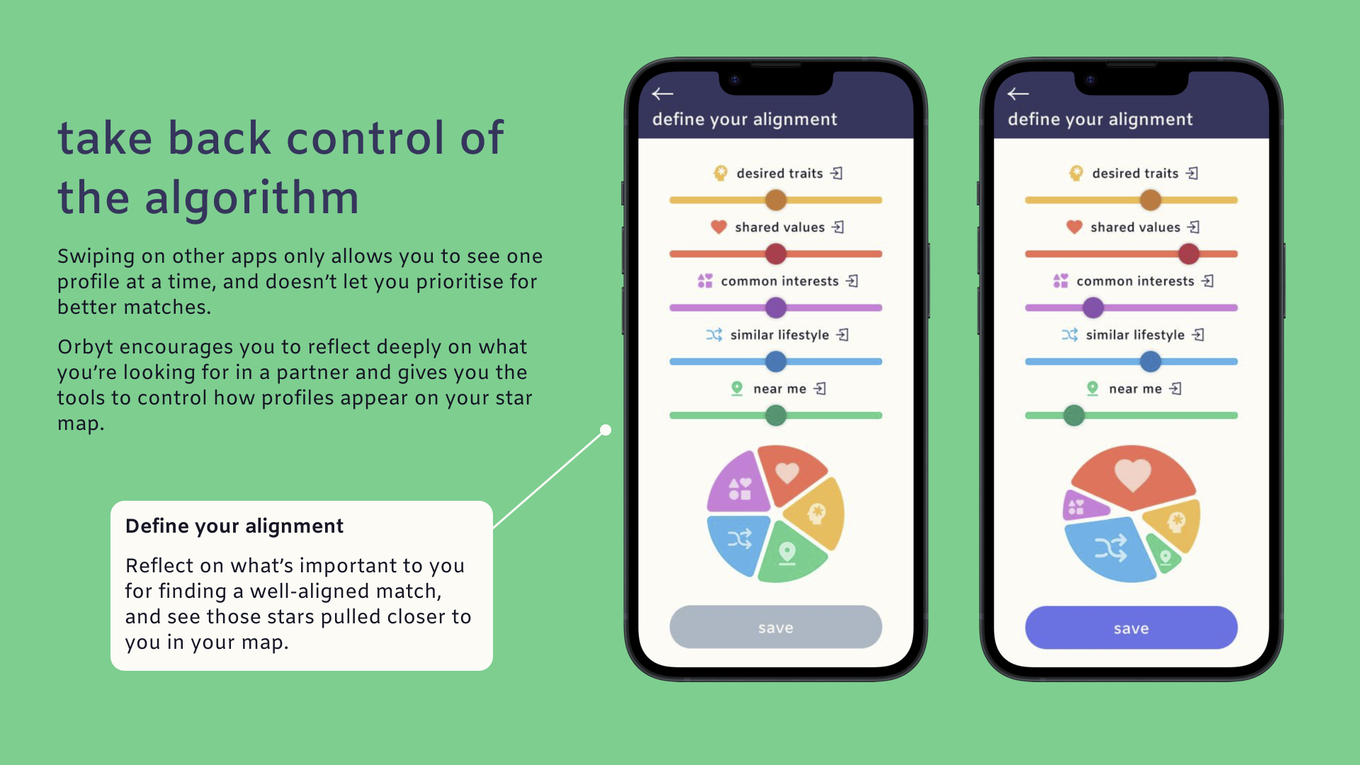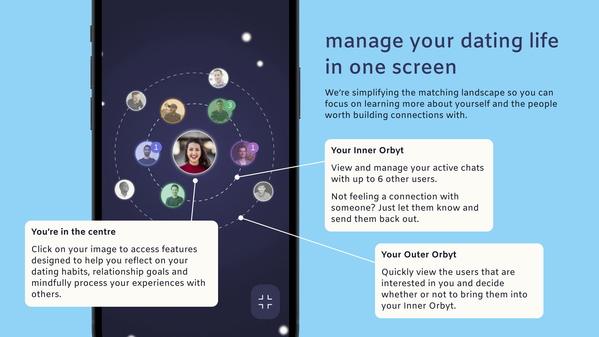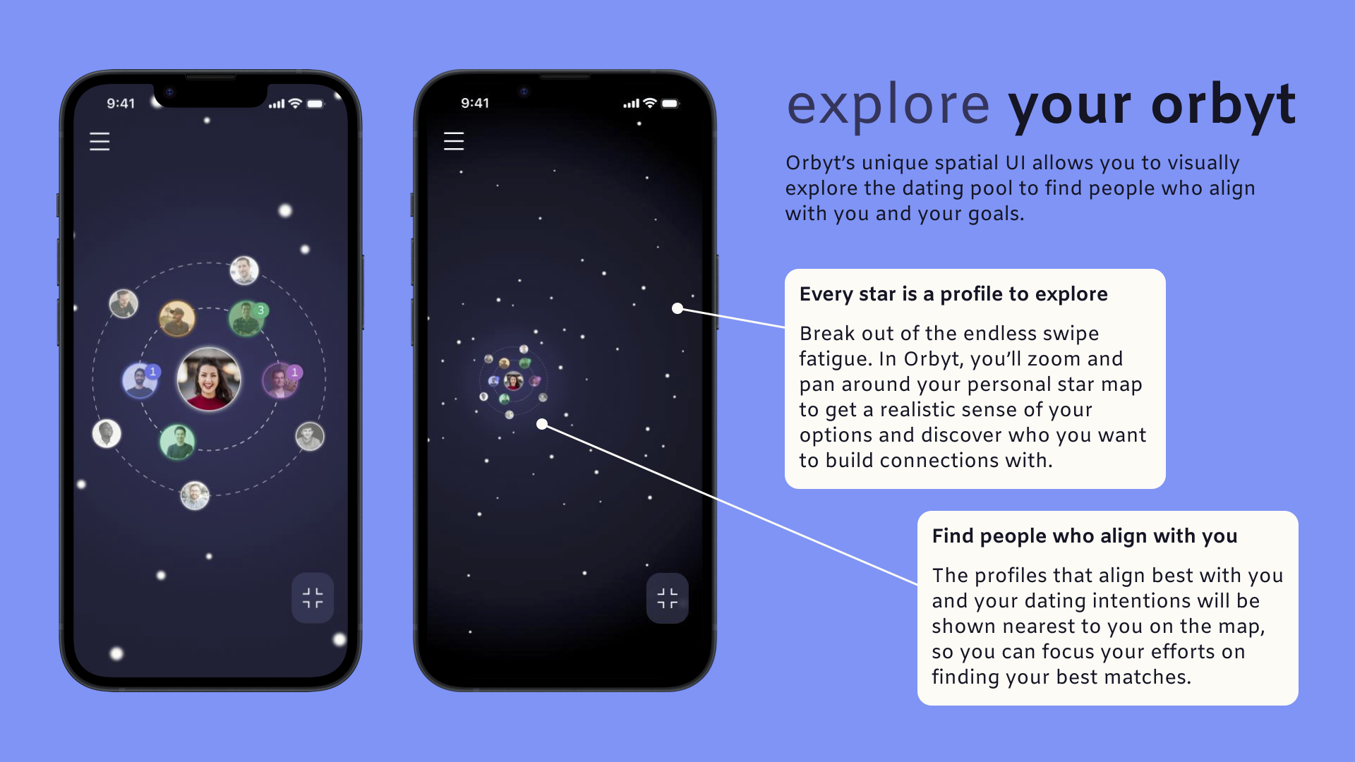 Each user sits at the centre of their own star map, a zoom/pan canvas that feels more spatial and exploratory than a deck of cards to swipe through. You have an inner and outer orbyt for keeping track of who you're actively talking to versus who's on your radar, and they fill up, which forces a decision: actually talk to this person, or unmatch and move on. No more endless lists of people you matched with once and quietly forgot about. And you control your own algorithm: you can see and adjust the signals that attract matches toward you, rather than having the app make those decisions invisibly.